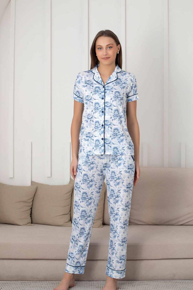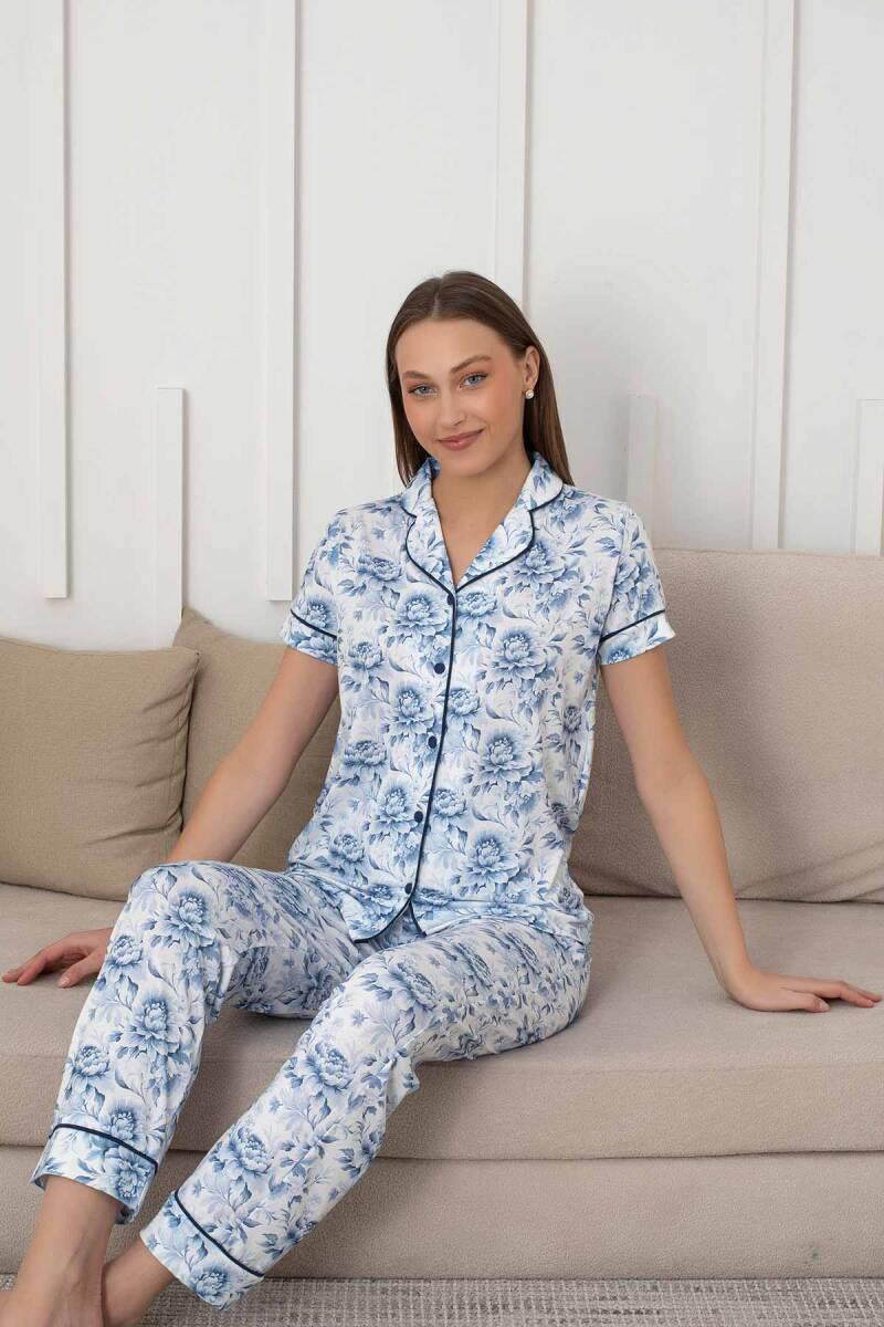 Çiçek Desenli Kadın Pijama Takımı - Boydan Düğmeli Likralı Viskon 2836KY