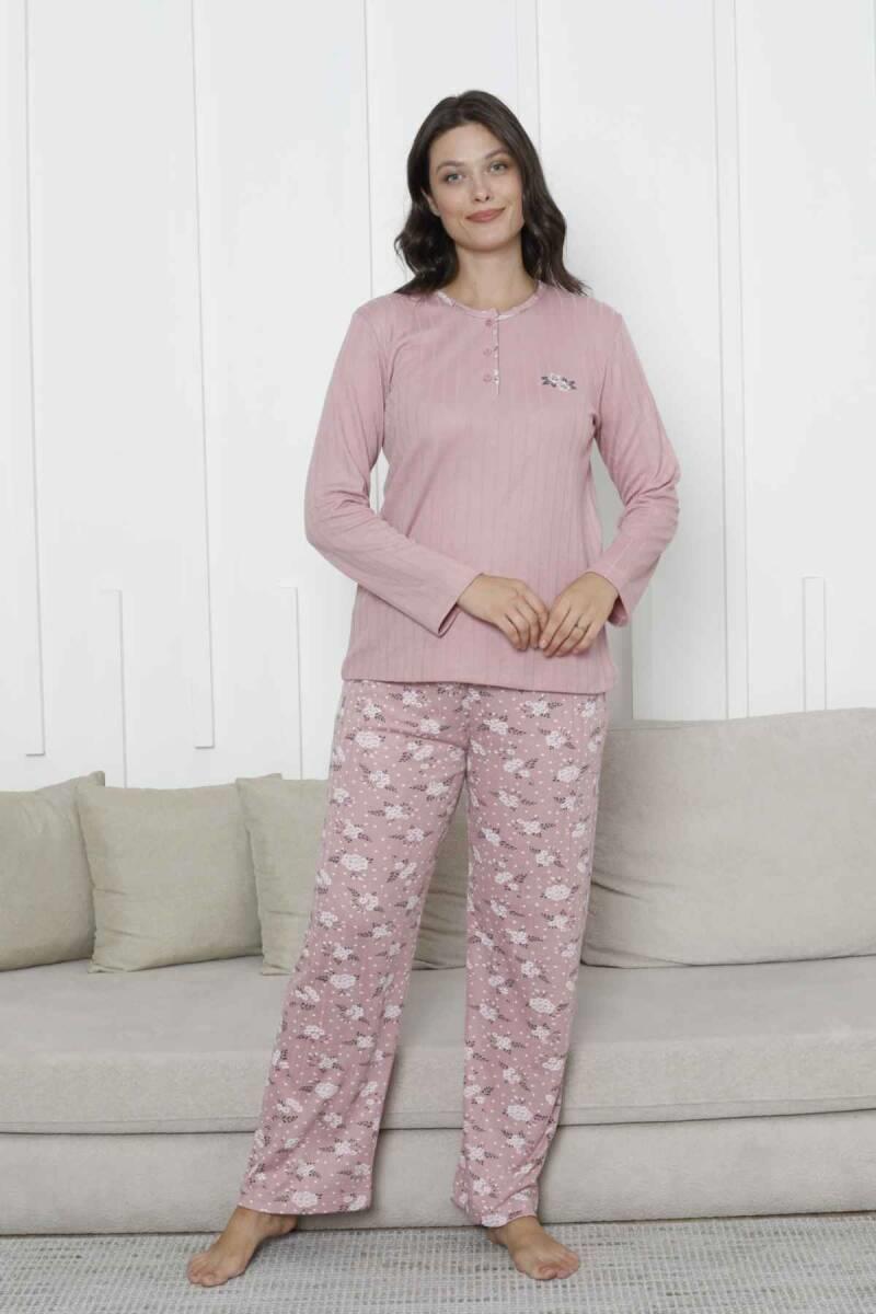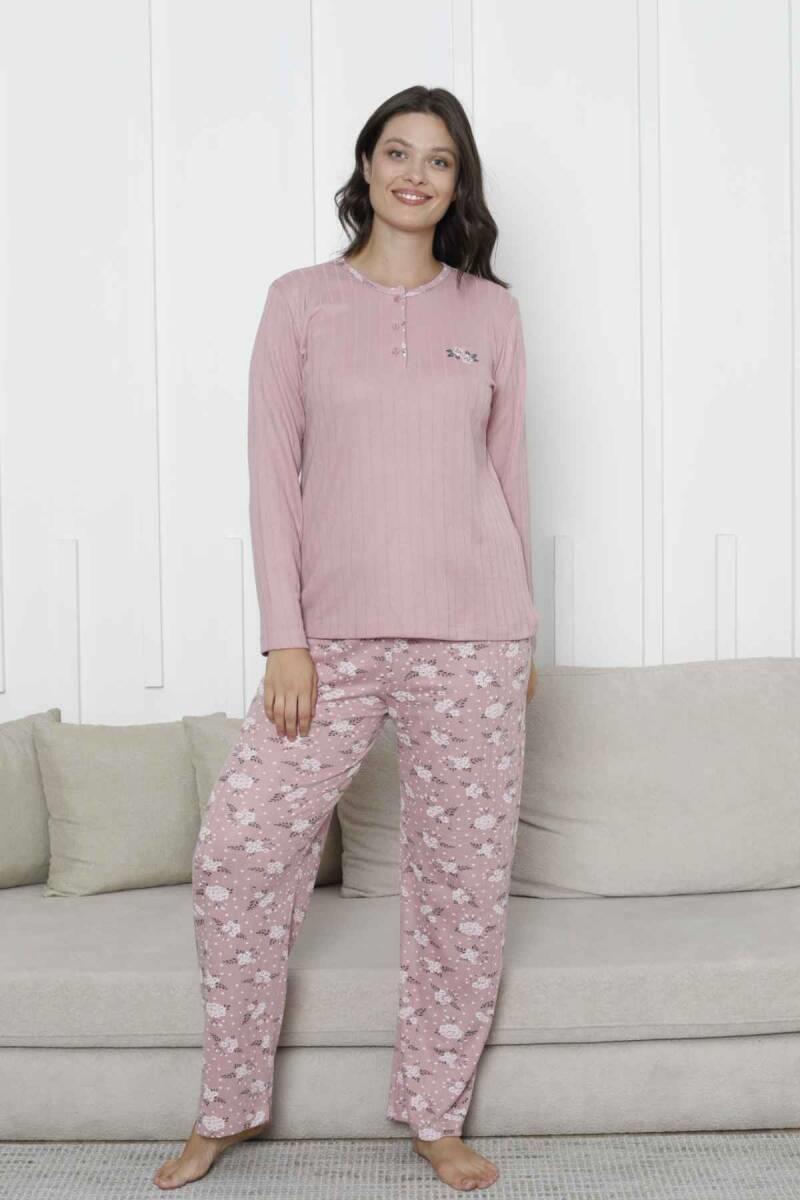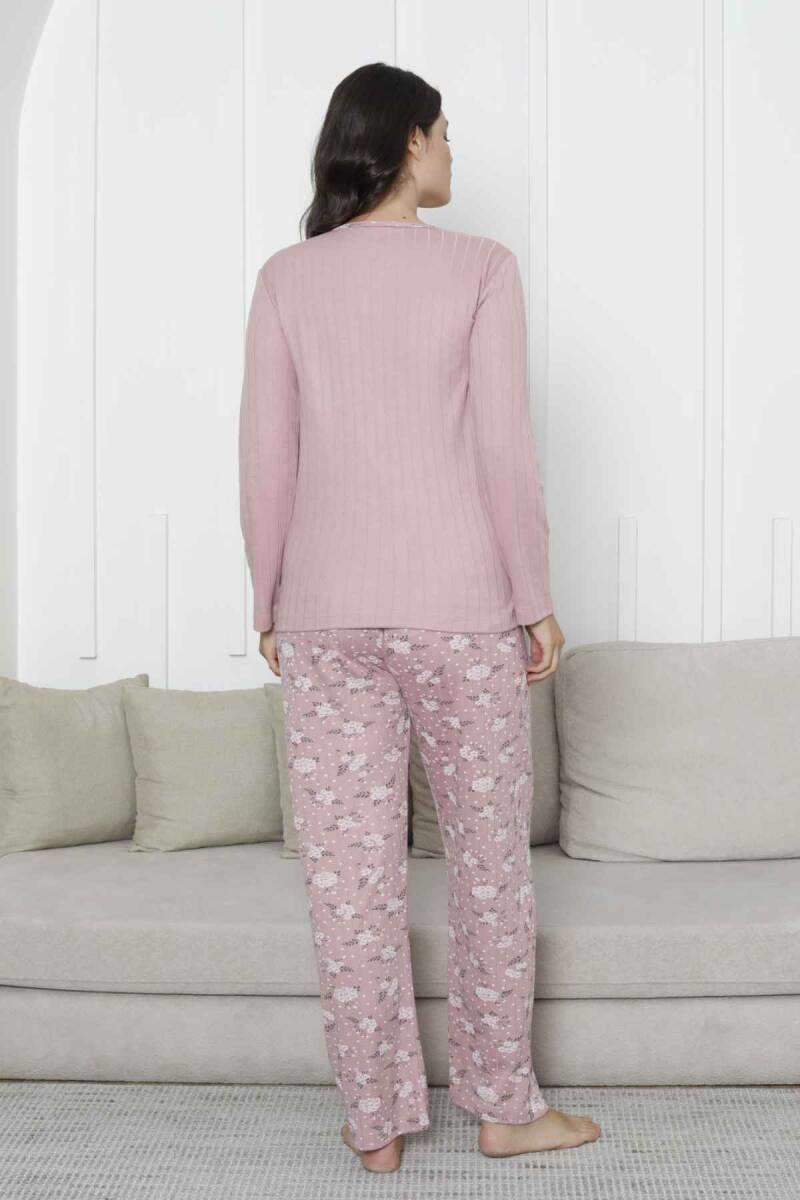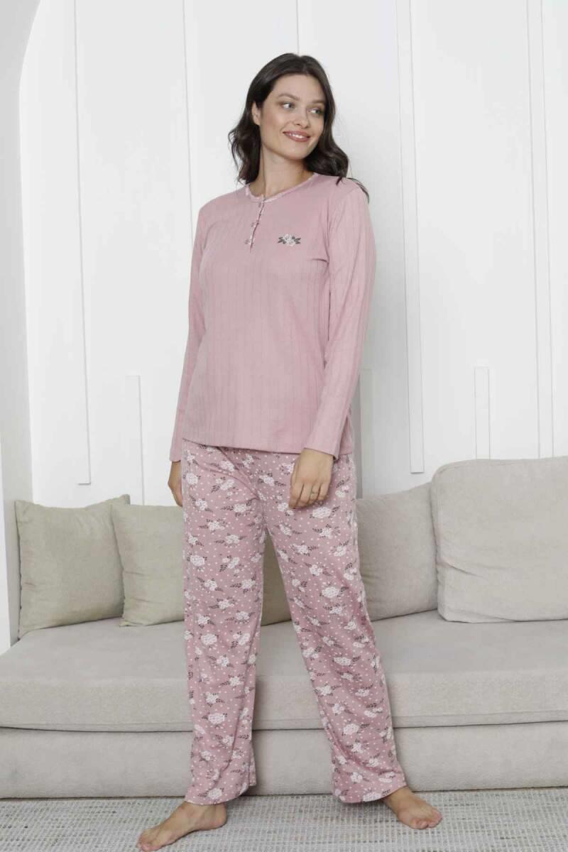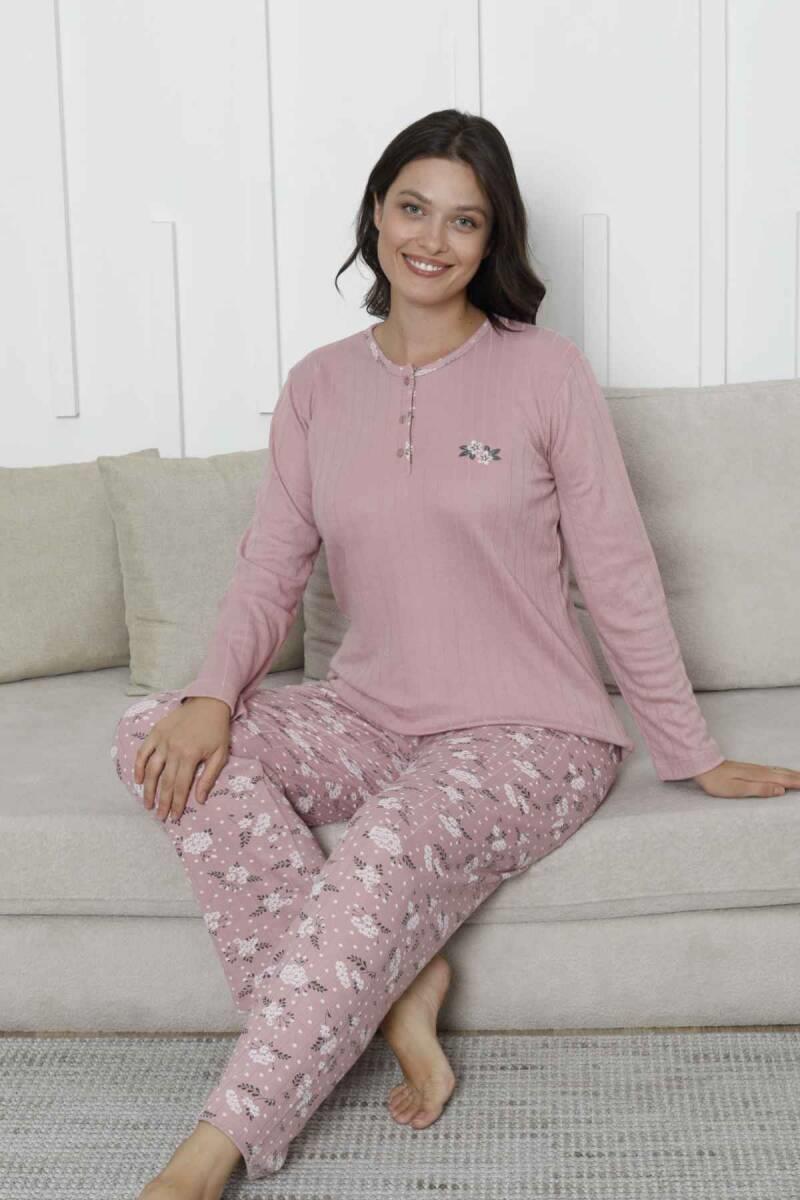 Çiçek Desenli Kadın Pijama Takımı - Gülkurusu Nakışlı Kışlık Şardonlu İnterlok 2879UK
