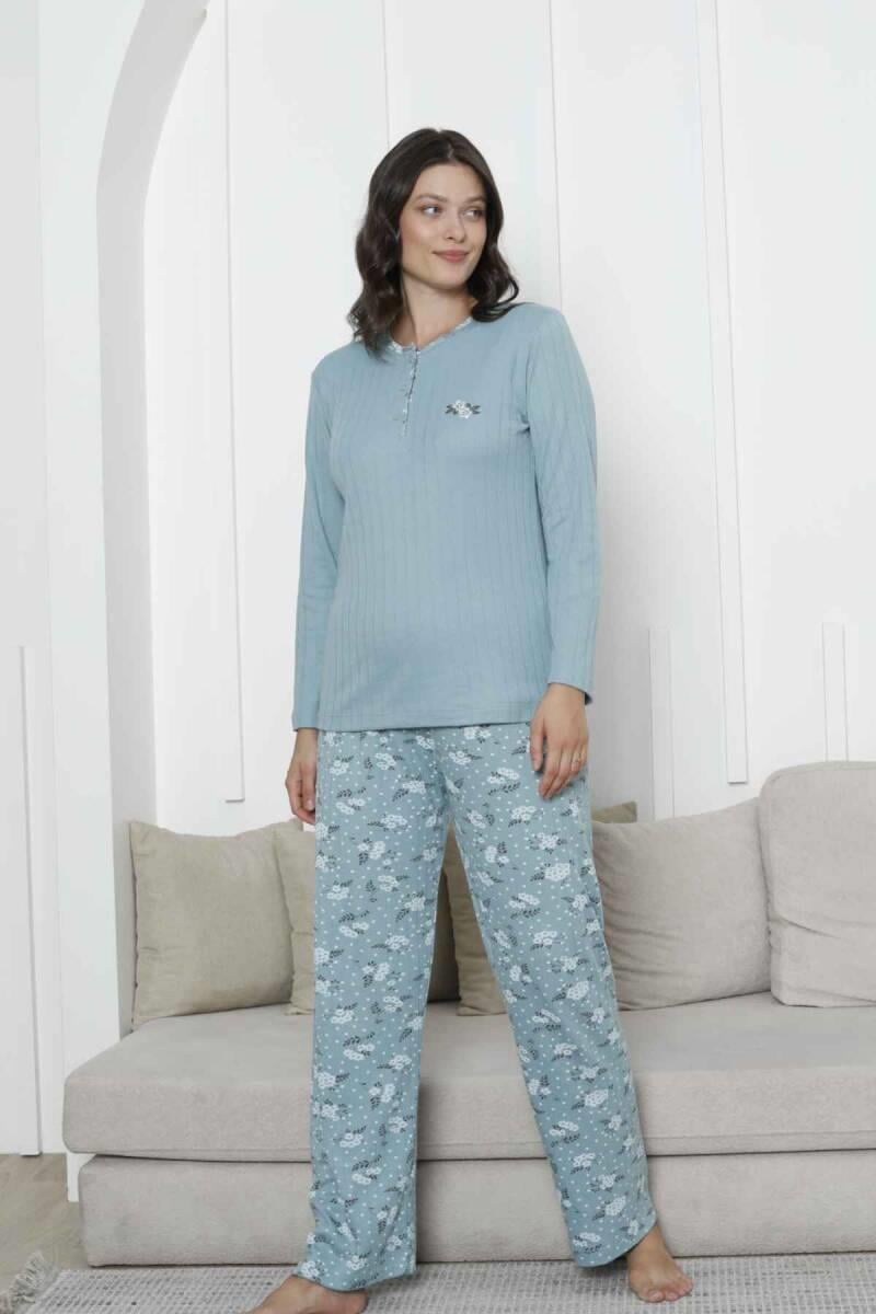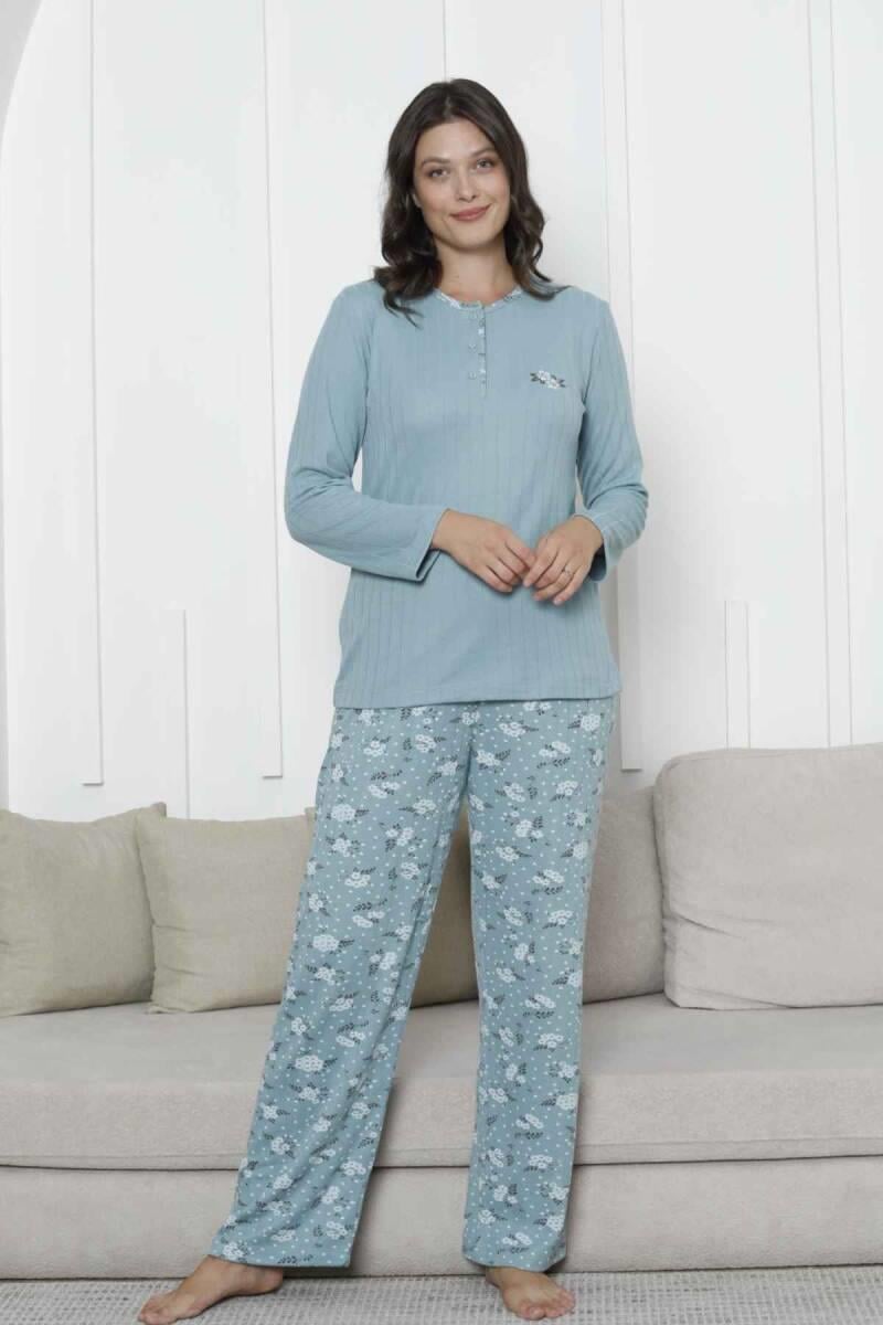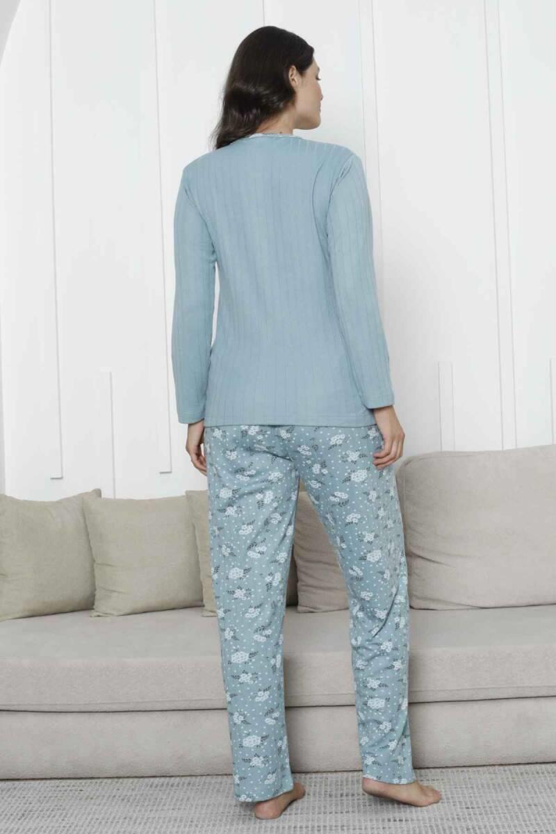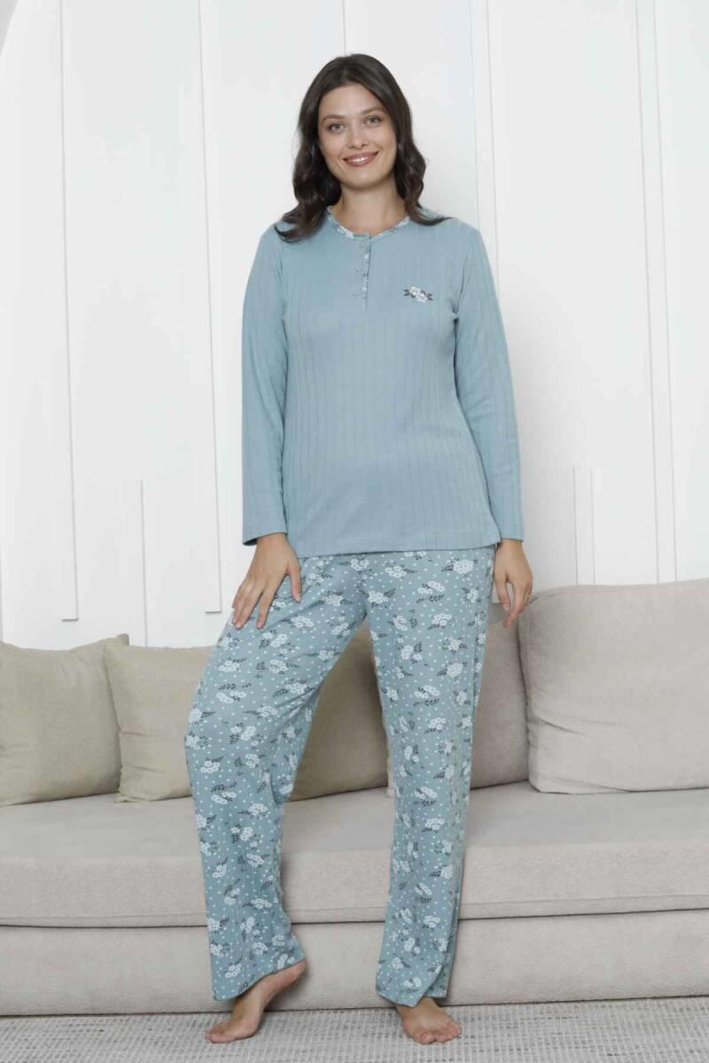 Çiçek Desenli Kadın Pijama Takımı - Yeşil Nakışlı Kışlık Şardonlu İnterlok 2879UK