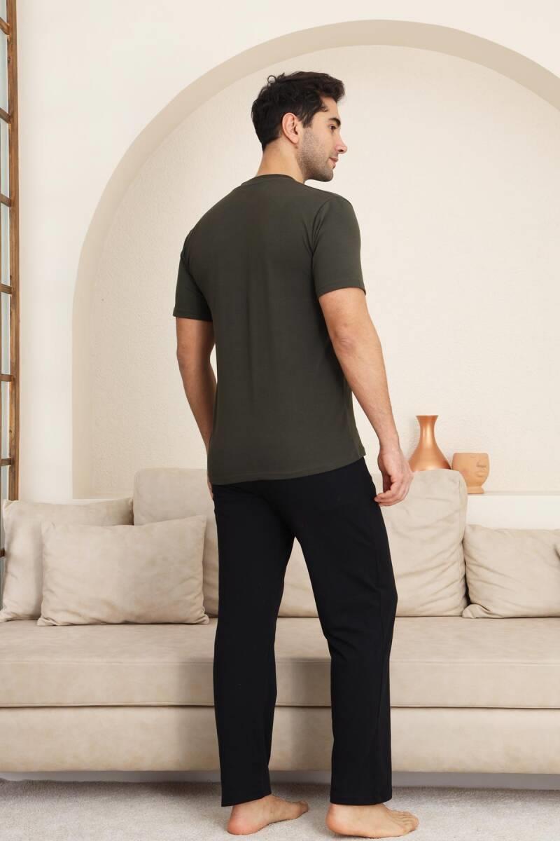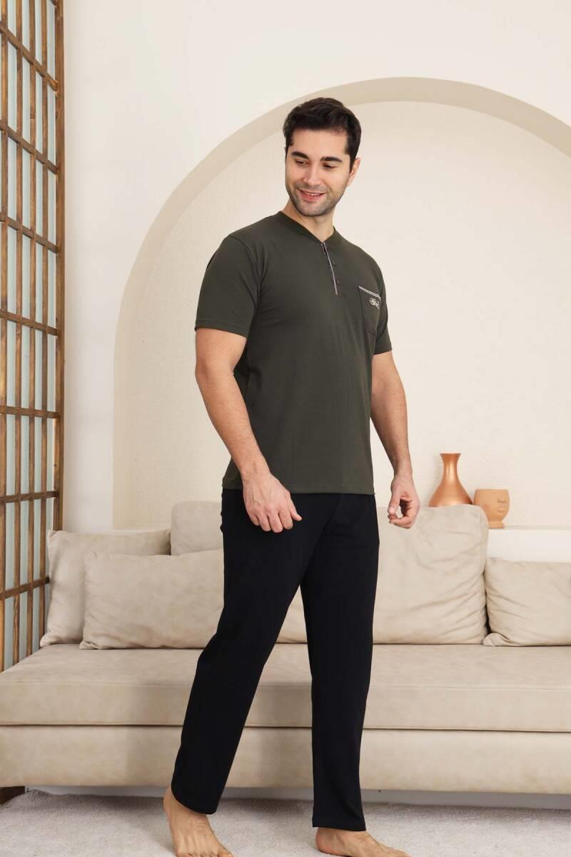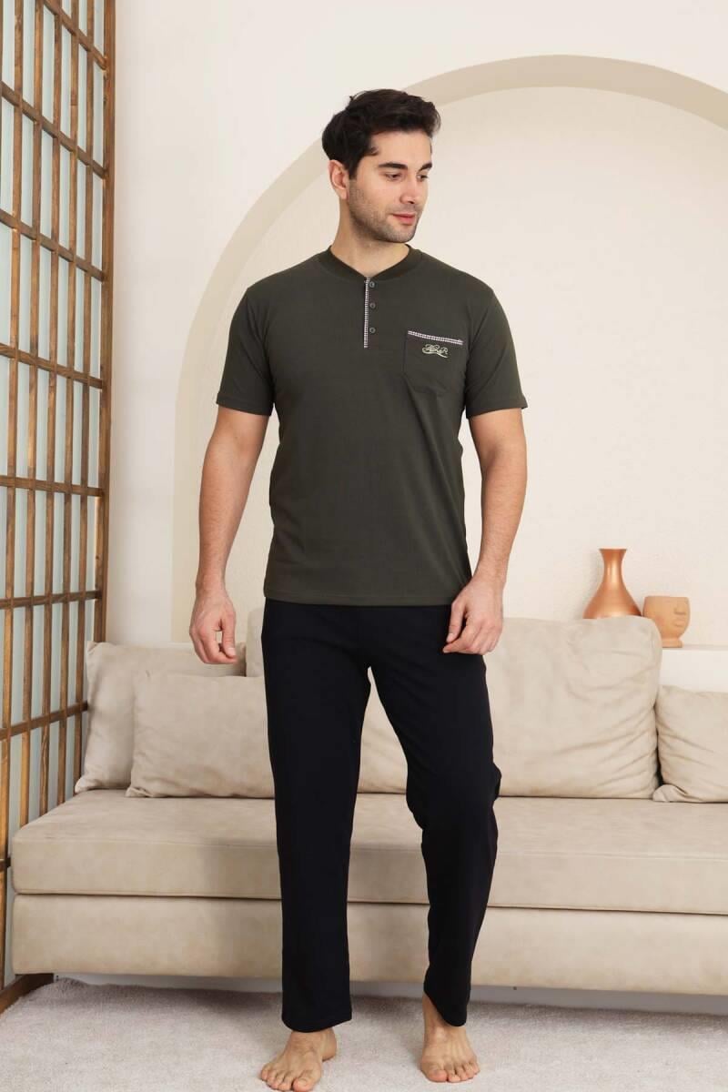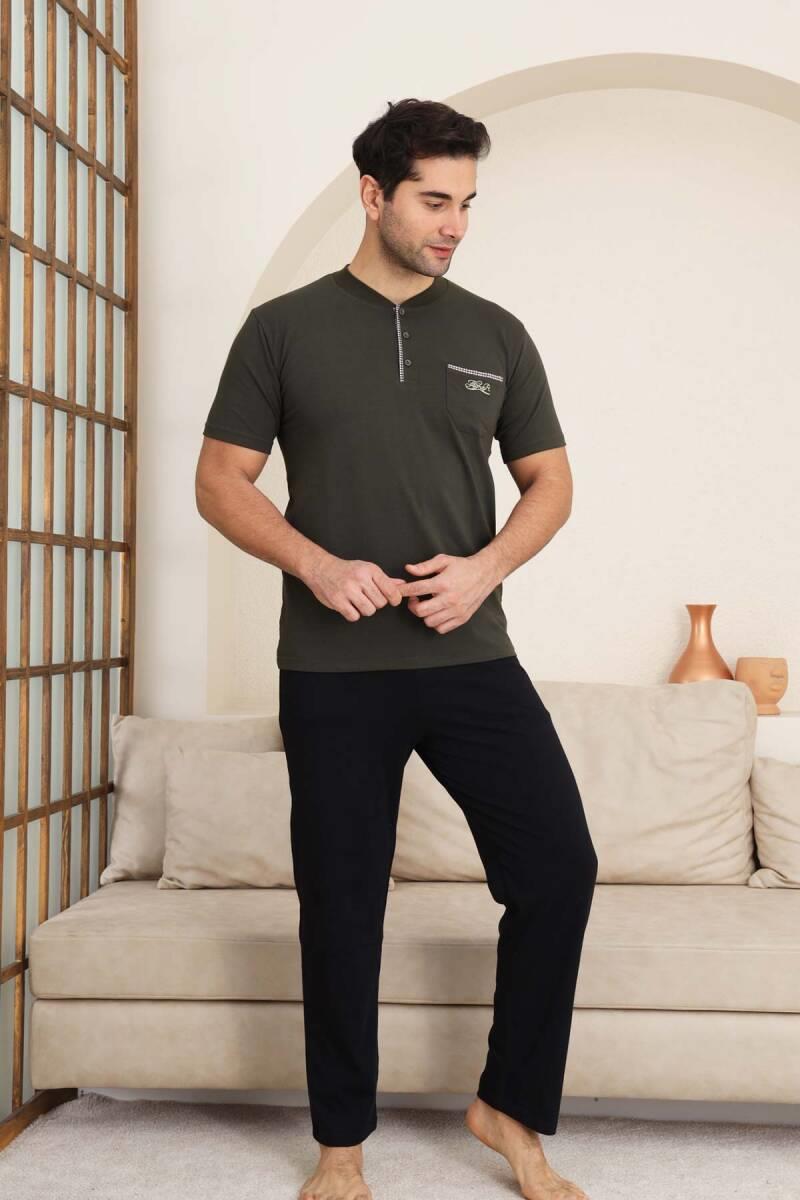 Erkek Pijama Takımı - Haki Arma Nakışlı Likralı Kısa Kollu Penye 1194KY