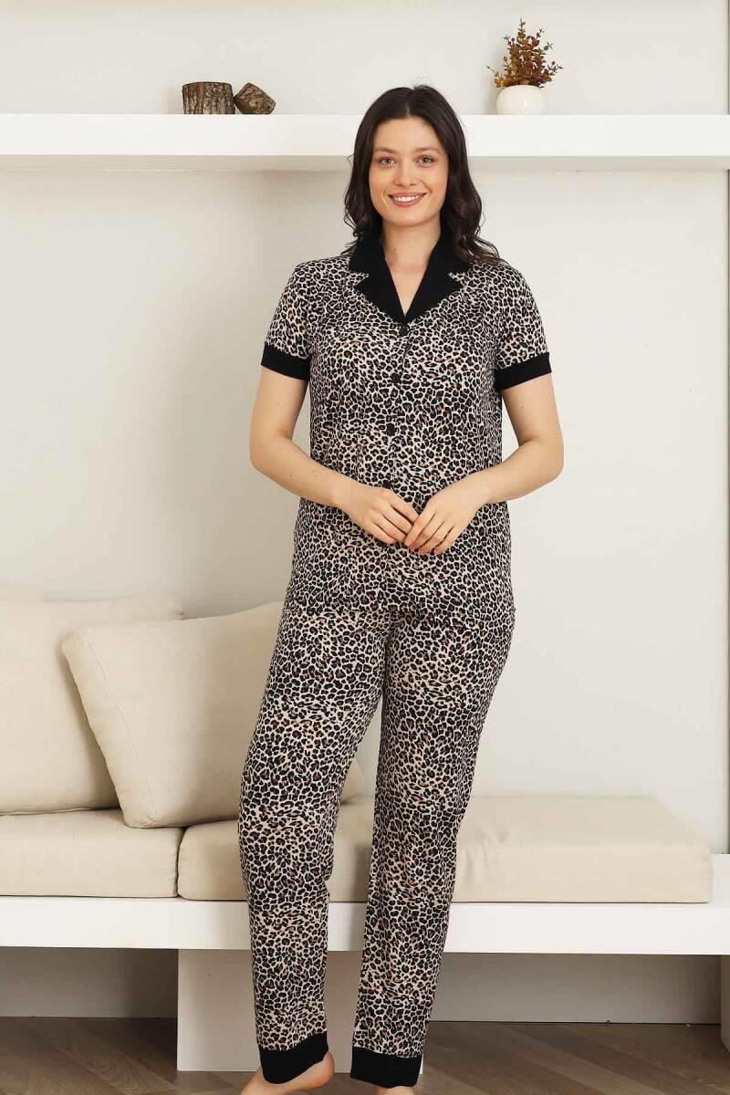 Leopar desenli Kadın Pijama Takımı - Bambu Likralı Kumaş Önden düğmeli Kısa Kol 2719KY